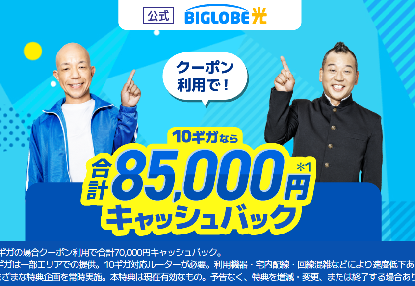 2026年4月時点の案内では、キャッシュバックは10ギガで合計85,000円、1ギガで合計70,000円が目安になっています。さらに、新規工事費相当の値引きや、乗り換え時の解約金サポートも確認できます。10ギガ向けの対象ルーター同時購入では総額から5,808円値引き、1ギガ向けでは対象ルーター購入で5,000円キャッシュバックの案内があります。